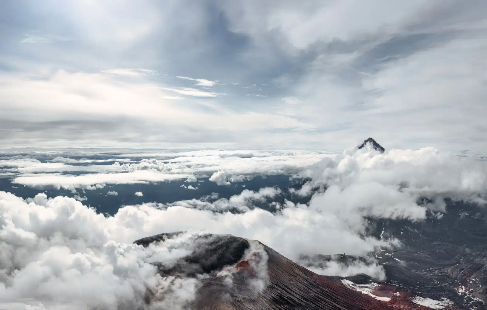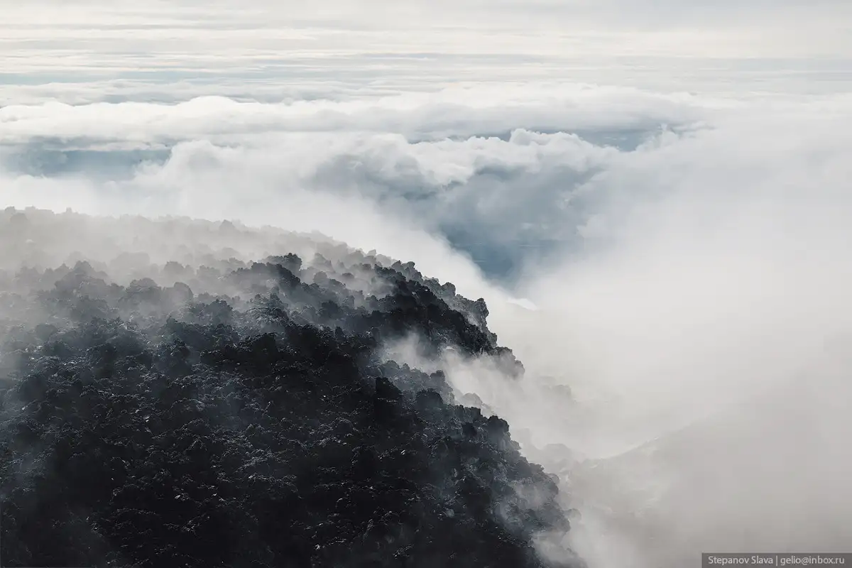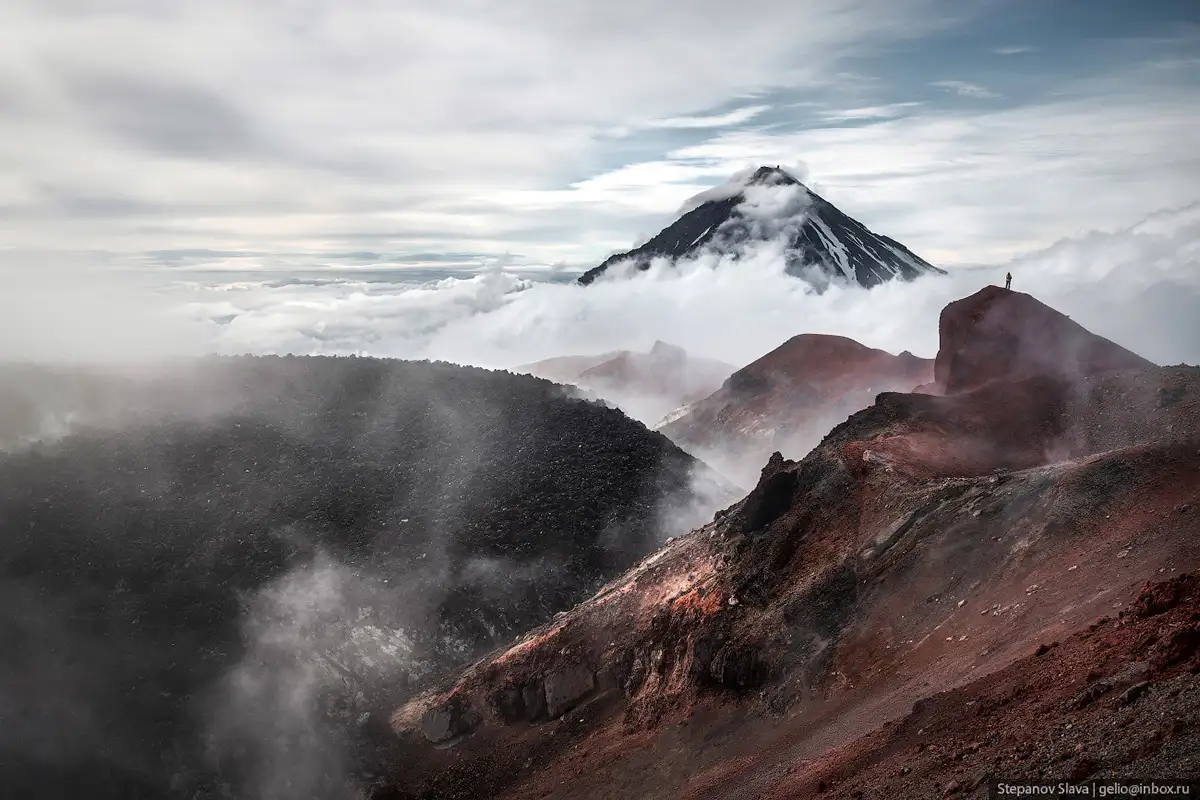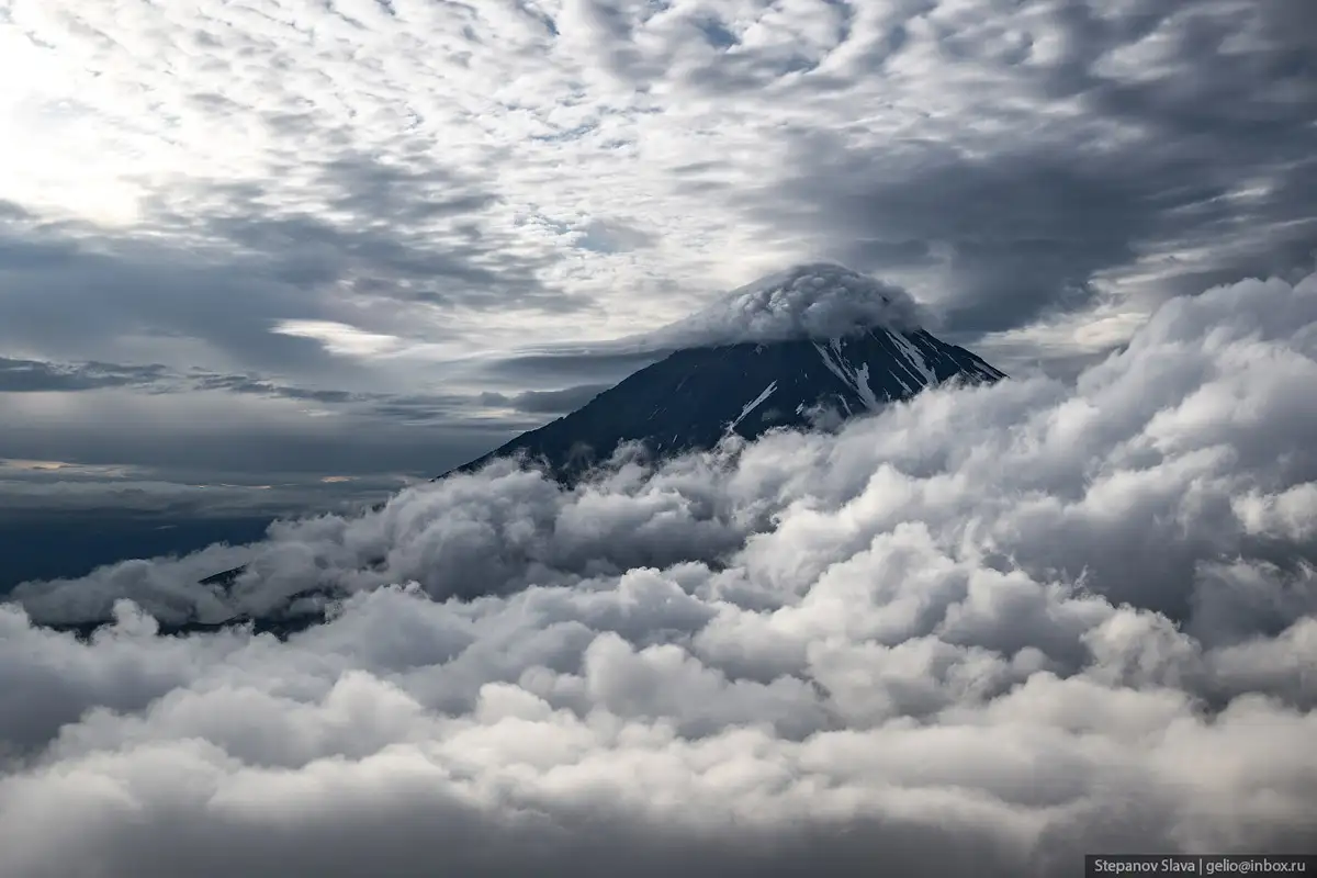 6. Сейчас на Авачинской сопке относительно спокойно — активны только фумаролы. Они выделяют горячие газы, над вулканом стоит облако сернистых испарений.